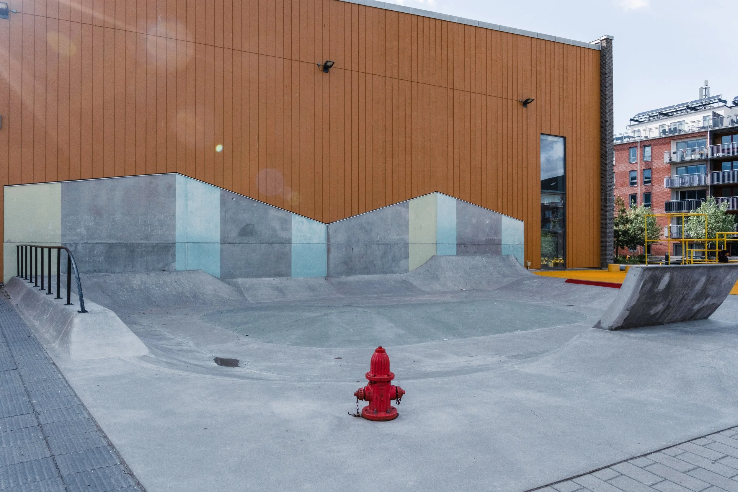 Features Liten park med slappy, QPs, wall ride, bump över brandpost och speedbumps. Ride-on rail för de som vågar! Är beläget på en skolgård, bäst tillgänglighet utanför skoltider.