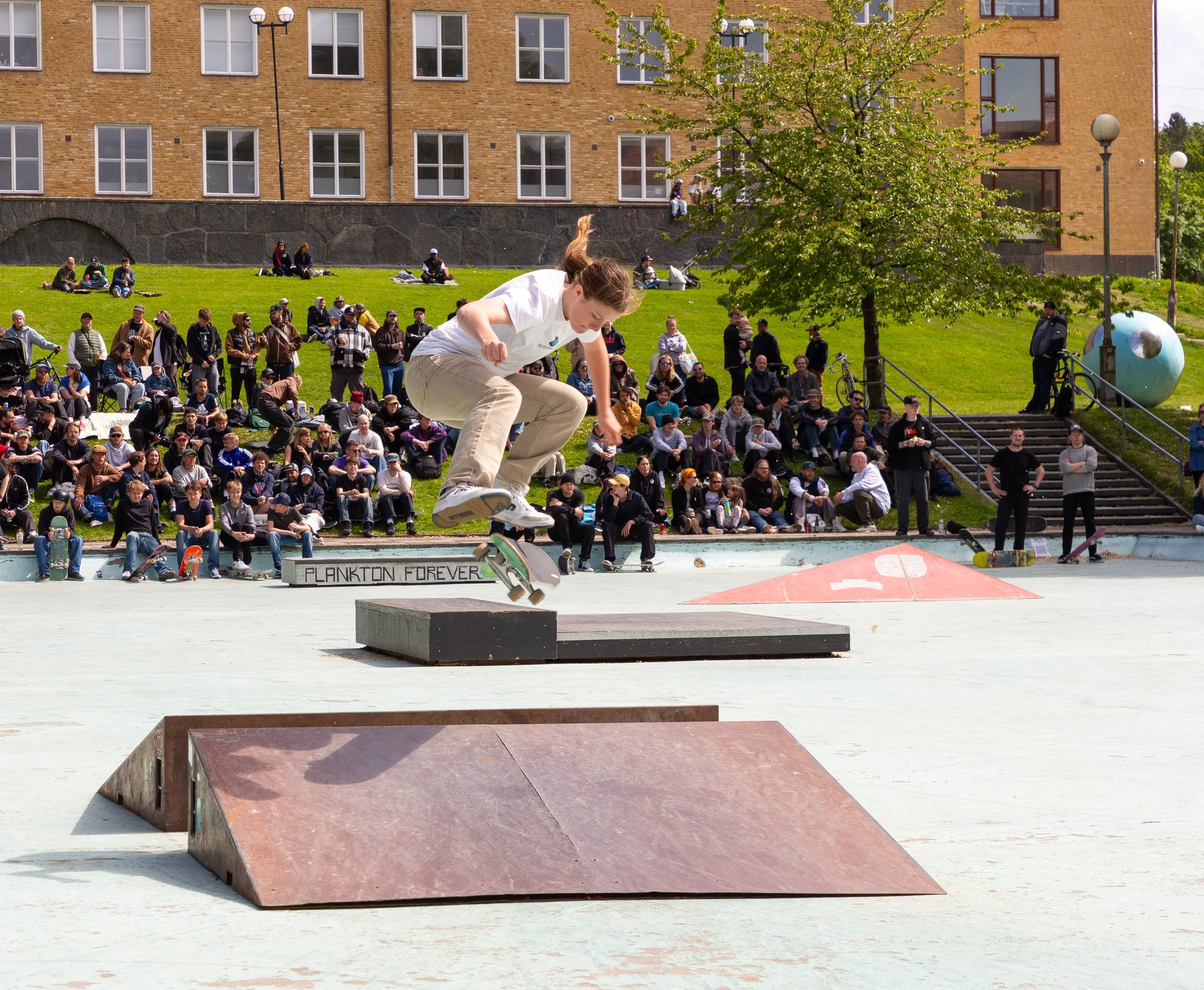 Yta 1000 m2 Belysning NejFeatures Damm som är vattenfylld vissa delar av året och annars en yta med streetobstacles som granitbänka, gap, spinn, rail mm