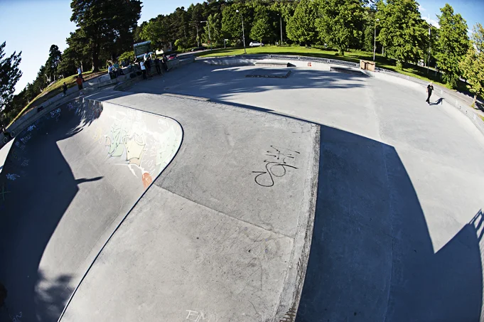 Features Stor streetyta med curbs, manual pad, små hippar, flat rails och små transitions. Bowlen har stora flacka böjar och är shapad som ett felvänt L